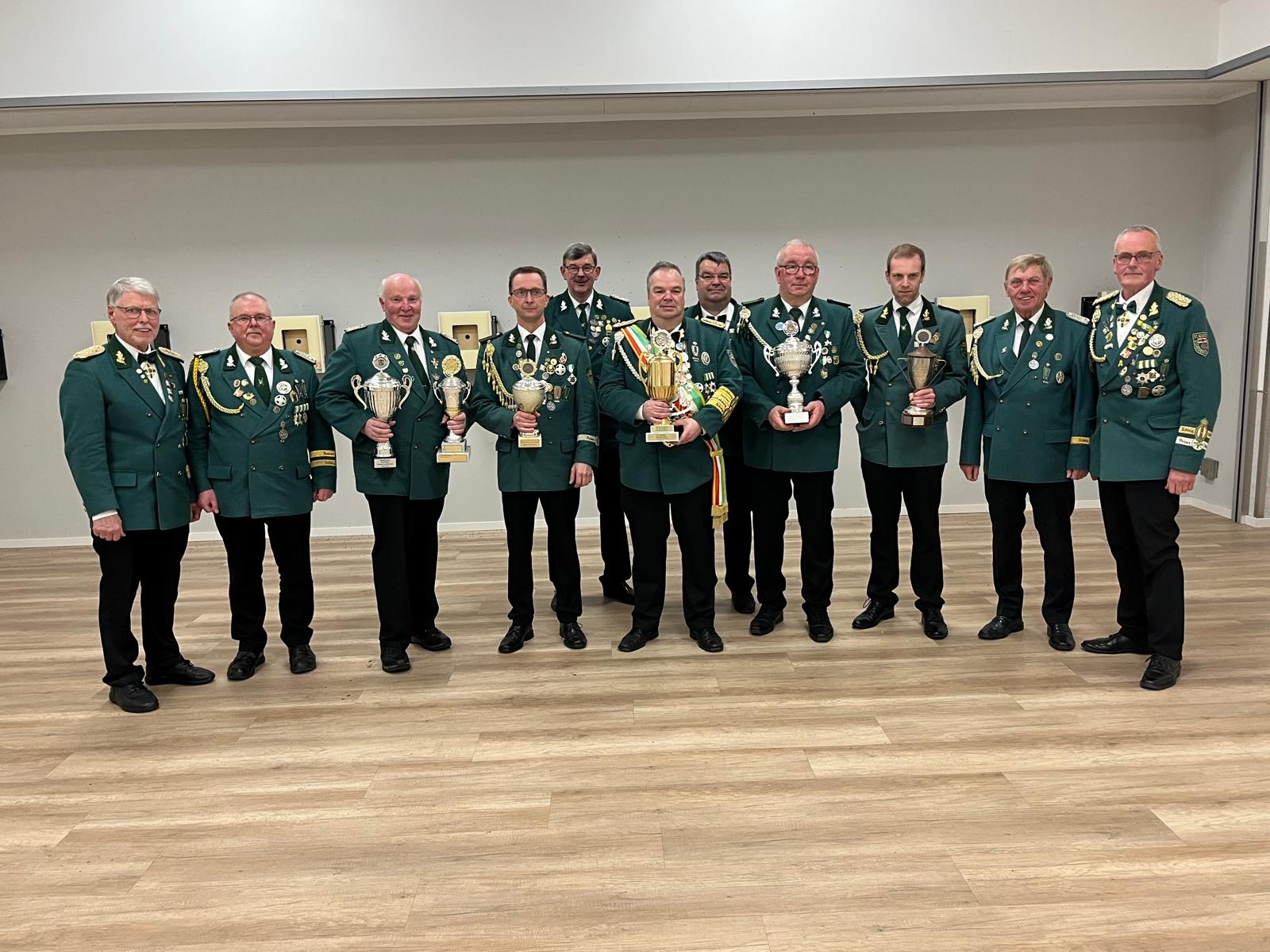 Foto: Zeremonienmeister Gerd Müller, Franz-Josef Neuwöhner 2. Platz Obristenpokal, Josef Biermeier 1. Prinzenpokal und 1. Platz Pokal der Bierkönige, Dirk Renneke Vereinsmeister Sportschützen Alterklasse aufgelegt, stellv. Schießmeister Wolfgang Fockel, Kaiser Frank Hachmann 1. Platz Königspokal, Schießmeister Andreas Hachmann, Olaf Niendorf 1. Platz Obristenpokal, Daniel Pott Vereinsmeister Sportschützen freistehend, Ludger Overkemping 2. Platz Obristenpokalschießen und 3. Platz Königspokal.