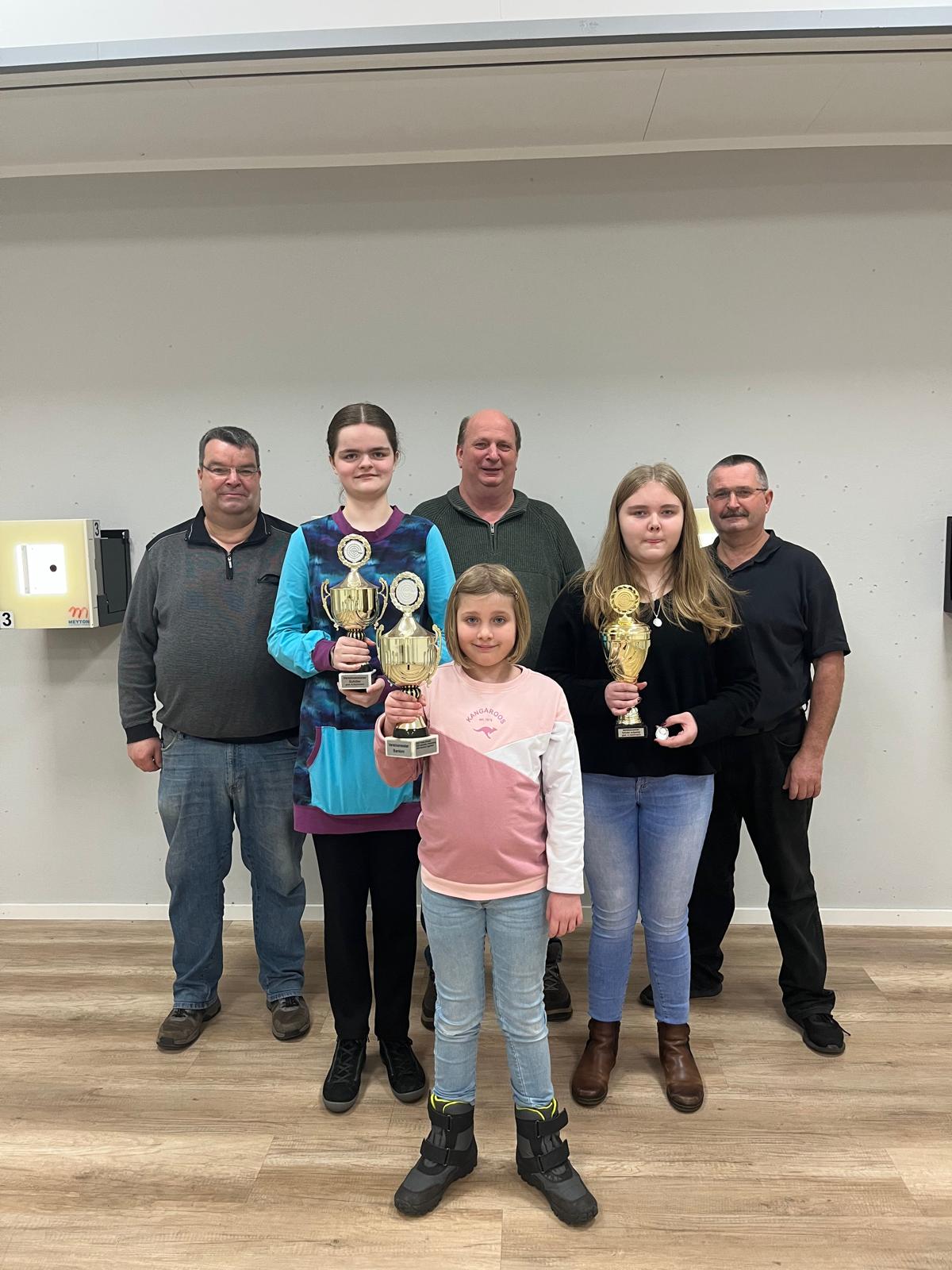 Foto: Schießmeister Andreas Hachmann, Mareike Stuckmann 1. Platz Schüler freistehend, Julia Gerkens 1. Platz Bambini-Klasse, Jugendtrainer Franz-Josef Biermeier, Johanna Bax 1. Platz Schüler aufgelegt und Jugendtrainer Sven Teßmann.