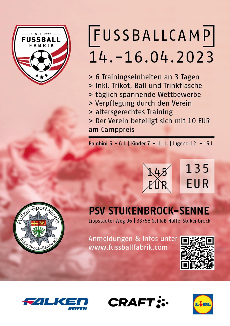 Nach der erfolgreichen Premiere im vergangenen Herbst, veranstaltet der PSV Stukenbrock-Senne, in Kooperation mit der Fußballfabrik OWL, auch in diesem Jahr wieder ein Fußballcamp für alle Kinder zwischen 5 und 15 Jahren.