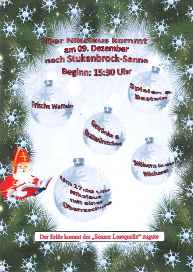 Für die Kinder gibt es Spiel und Bastelmöglichkeiten im Pfarrheim und in der Bücherei können neue Gesellschaftsspiele getestet werden. Im Verlauf des Nachmittags kommt der Nikolaus und bringt für die Kinder eine Überraschung mit. Die musikalische Unterhaltung wird von Trompetern und dem St. Achatius-Musikkreis gestaltet. Herzliche Einladung an alle Bewohnerinnen und Bewohner von Stukenbrock-Senne zu unserer gemütlichen Nikolausfeier.